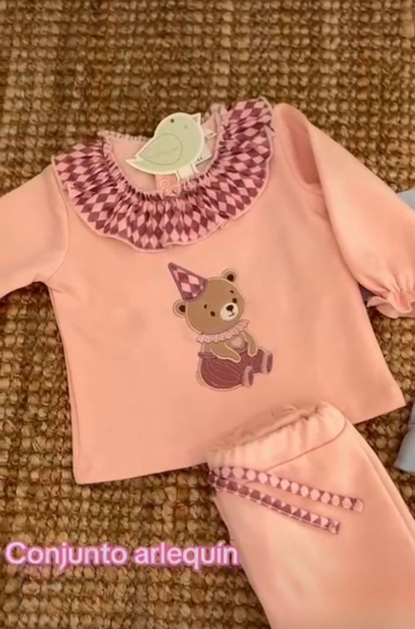 El Conjunto Arlequín Rosa es una auténtica monada pensada para que tu peque esté cómoda, calentita y guapísima en los días más frescos.