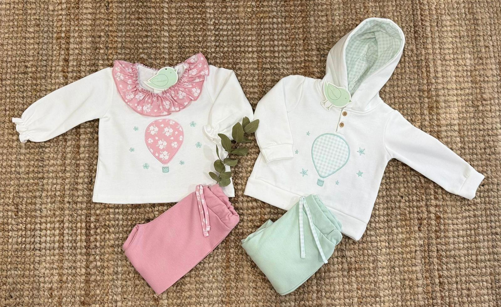 Conjunto de sudadera con dibujo de globo aerostático y pantalón jogger a juego.