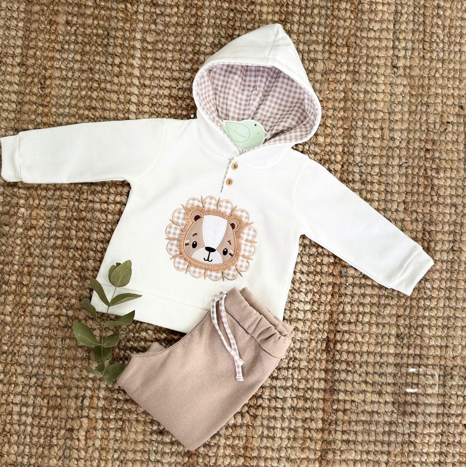 La sudadera en tono crudo incluye capucha forrada en cuadros vichy y un simpático bordado de león con aplicaciones en tela, mientras que el pantalón en tono beige aporta comodidad y estilo.
