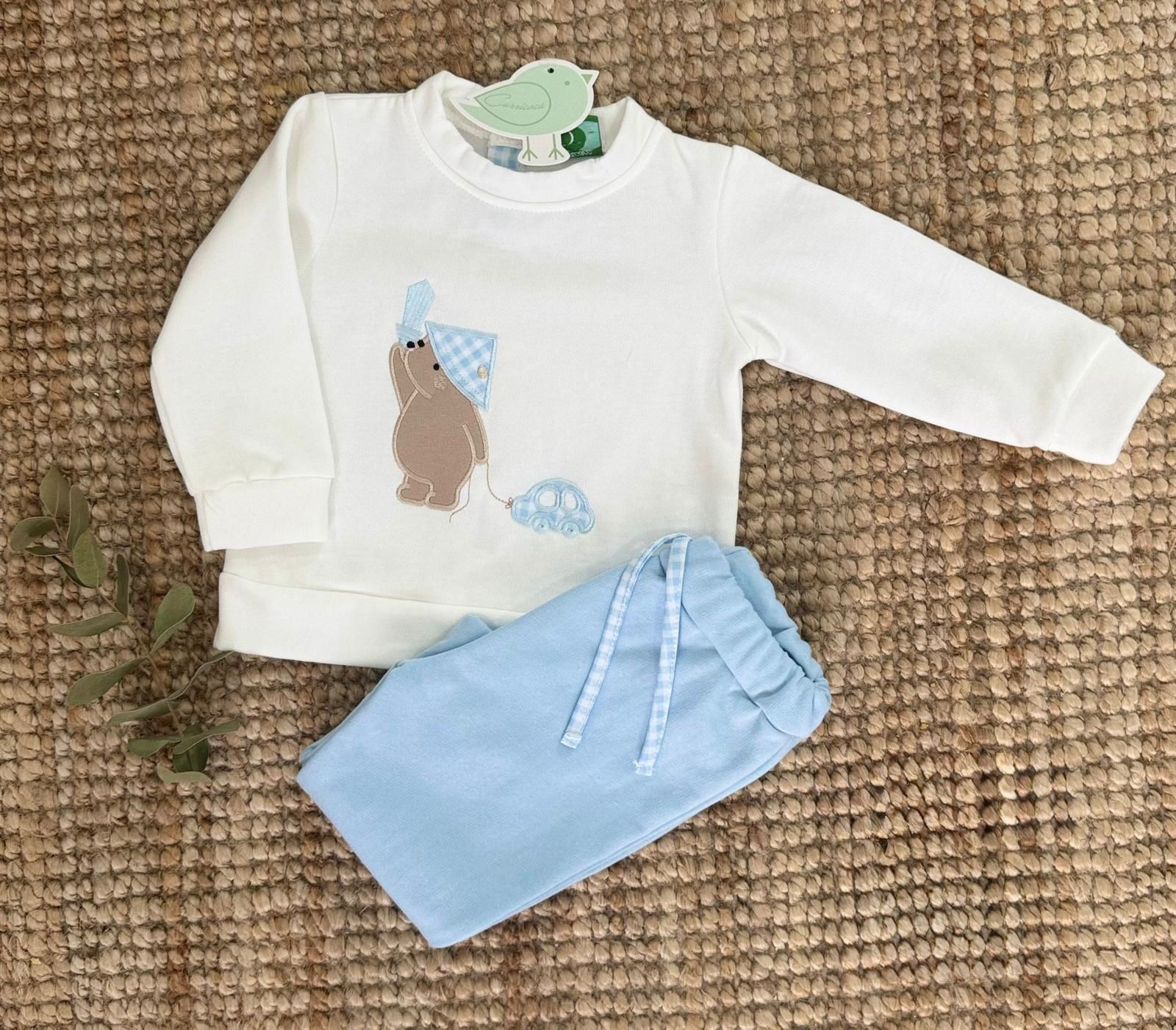Sudadera blanca con osito aplicado, pañuelito vichy celeste y un cochecito bordado con volumen. Combina con pantalón azul cielo de algodón con cordón decorativo a juego.