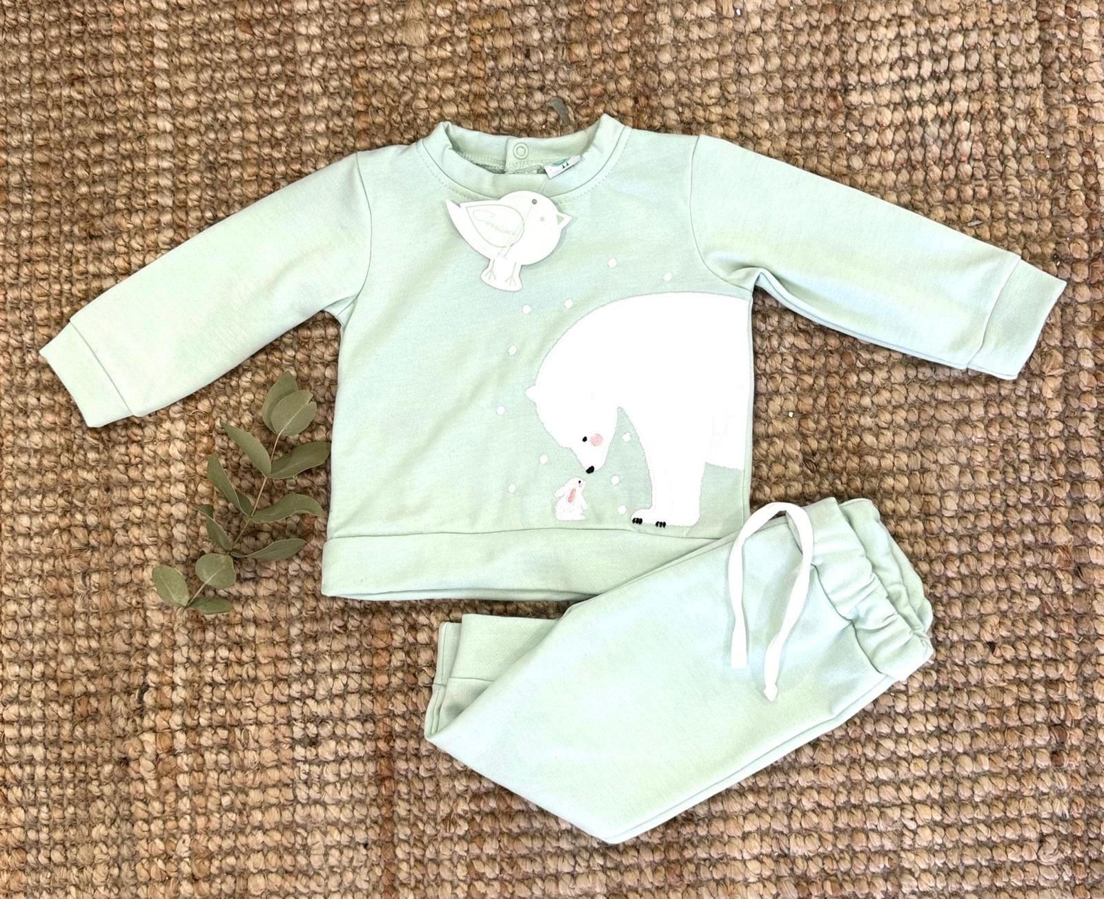 Un conjunto lleno de ternura para los días de juego y confort. Este conjunto de dos piezas está confeccionado en un suave tono verde pastel y decorado con un adorable oso polar acompañado de un pajarito.