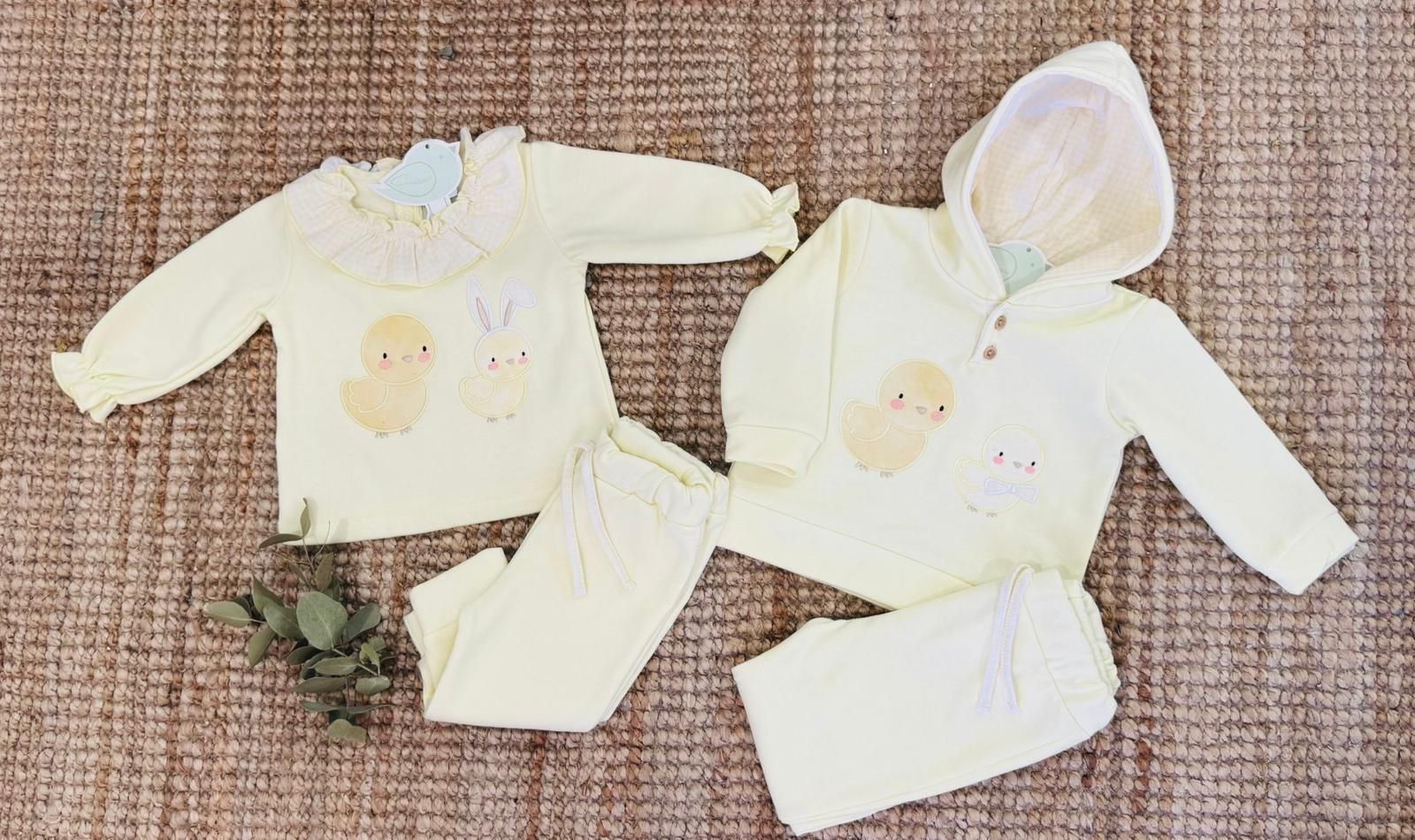 👕 Modelo sudadera : sudadera de manga larga con volante en el cuello y estampado de dos pollitos, uno de ellos con orejitas de conejo, acompañado de pantalón a juego.
