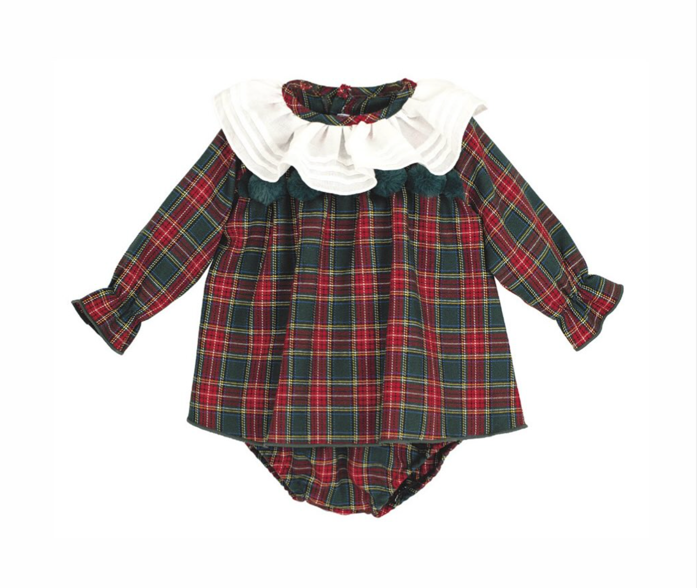 Este jesusito está confeccionado en tejido de cuadros escoceses en tonos rojo, verde y amarillo, un clásico atemporal que nunca pasa de moda. Destaca por su cuello de plumeti blanco plisado, decorado con pequeños pompones verdes, que aportan un toque dulce y festivo.