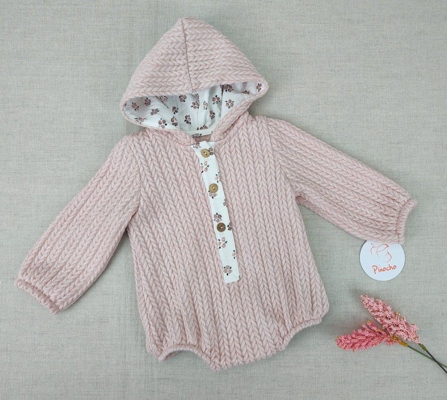 Este pelele de punto grueso es ideal para mantener calentita a tu peque sin renunciar al estilo. Su diseño de ochos en color rosa empolvado combina calidez, dulzura y comodidad en una sola prenda.
