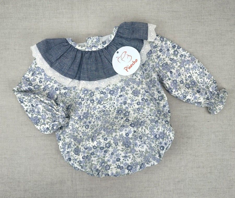 El pelele cuenta con un cuello volante en tejido denim azul con delicado encaje blanco, que le da un aire romántico y distinguido. Sus mangas largas con elástico en los puños aseguran un ajuste cómodo, mientras que los cierres traseros y en la parte inferior facilitan el cambio de ropa y pañal.