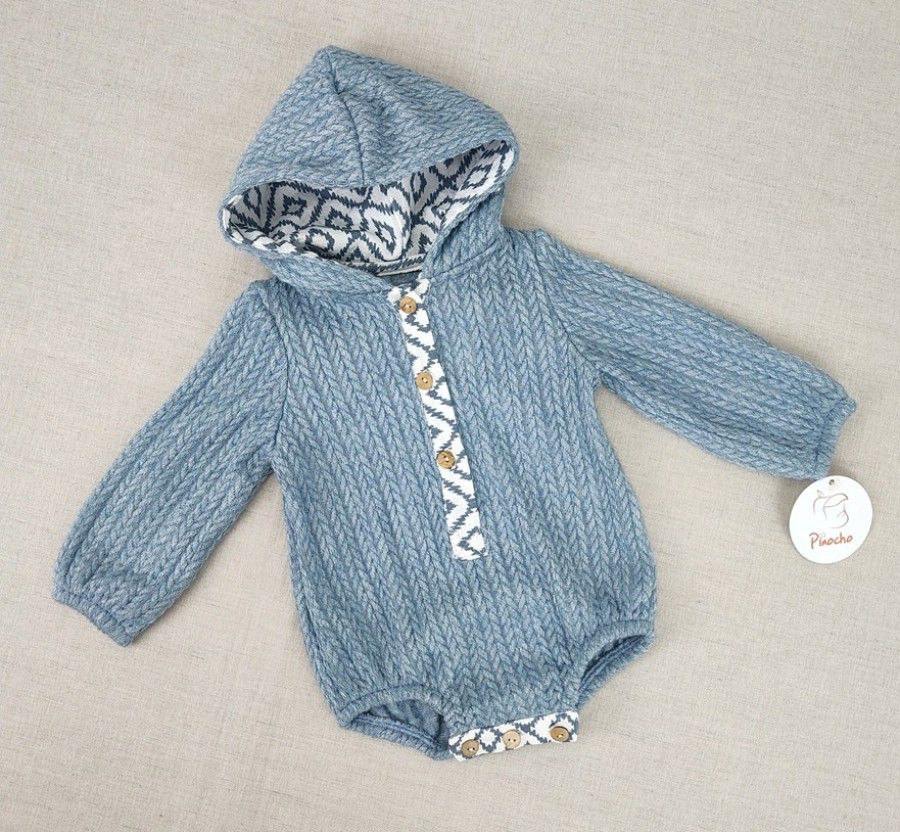 Este encantador pelele está confeccionado en punto trenzado azul con detalles en estampado geométrico azul y blanco en la tapeta, la capucha y la entrepierna.