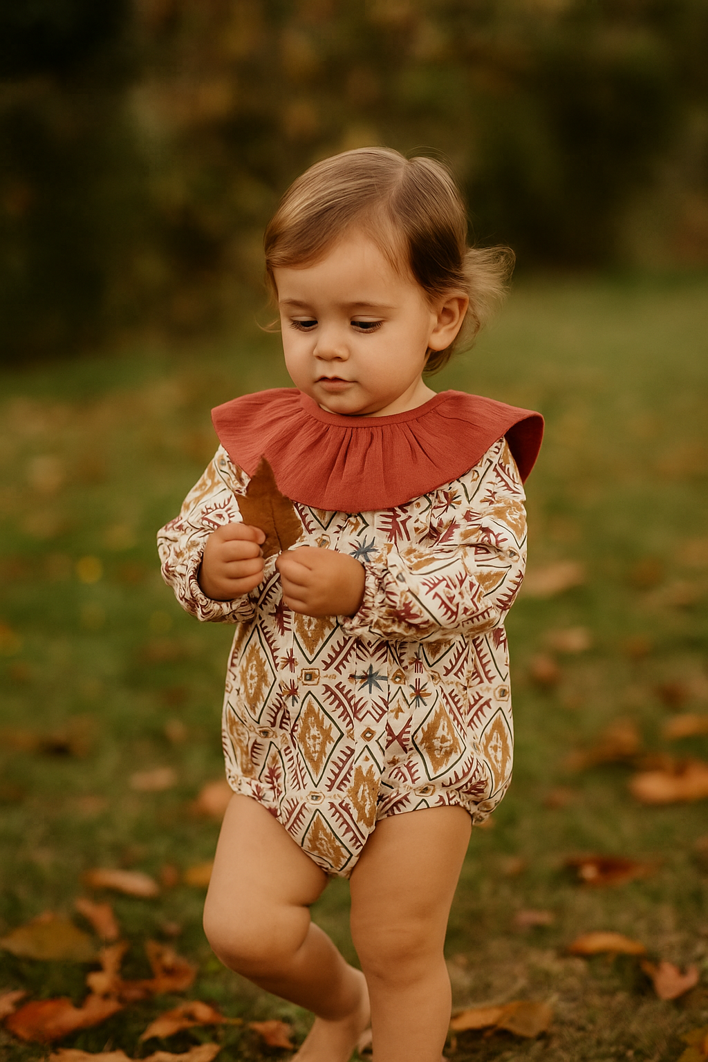 Este pelele destaca por su estampado geométrico en tonos mostaza, burdeos y azul, combinado con un cuello de gasa en color teja.