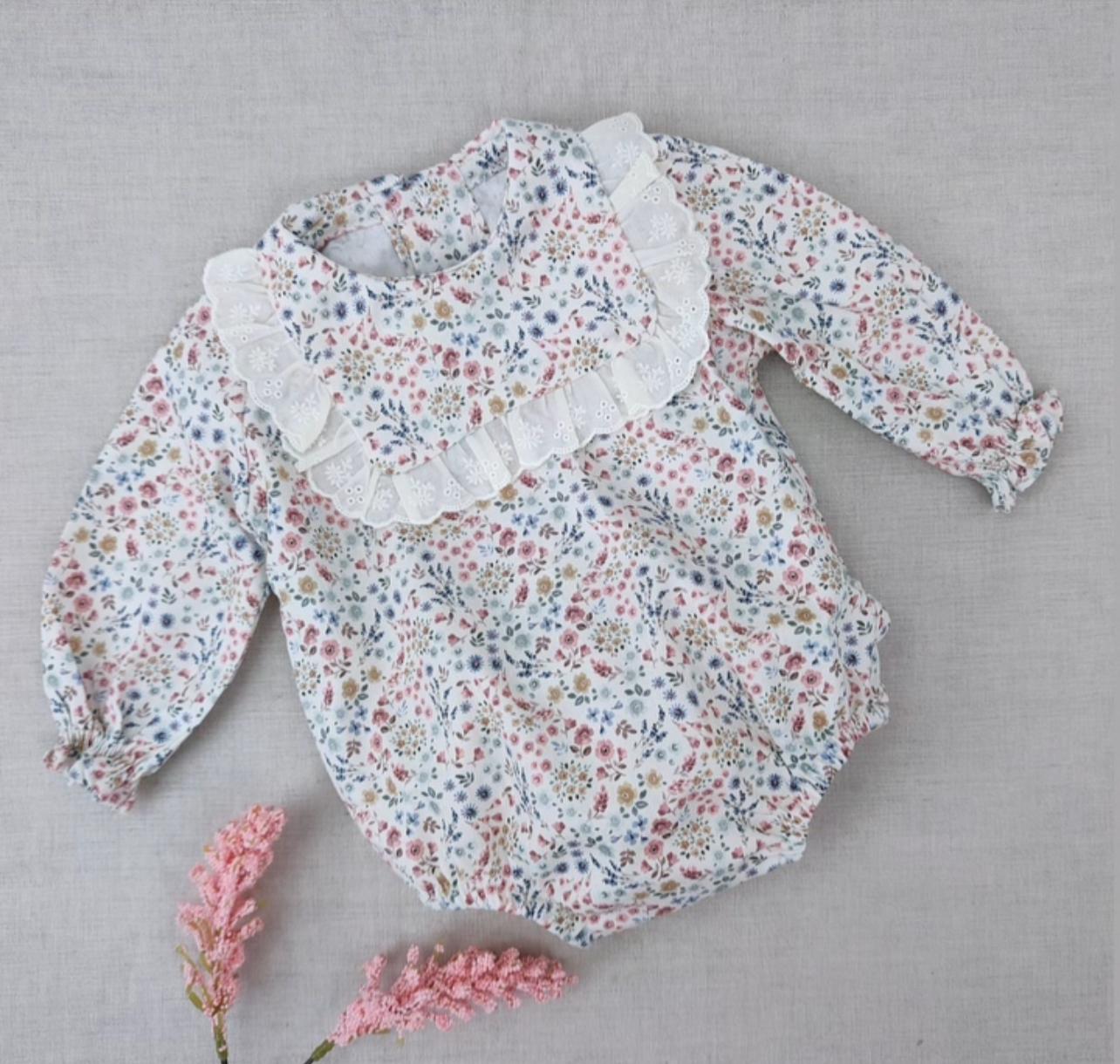 Este pelele de manga larga destaca por su estampado floral en tonos suaves y un elegante cuello con volante y puntilla bordada.