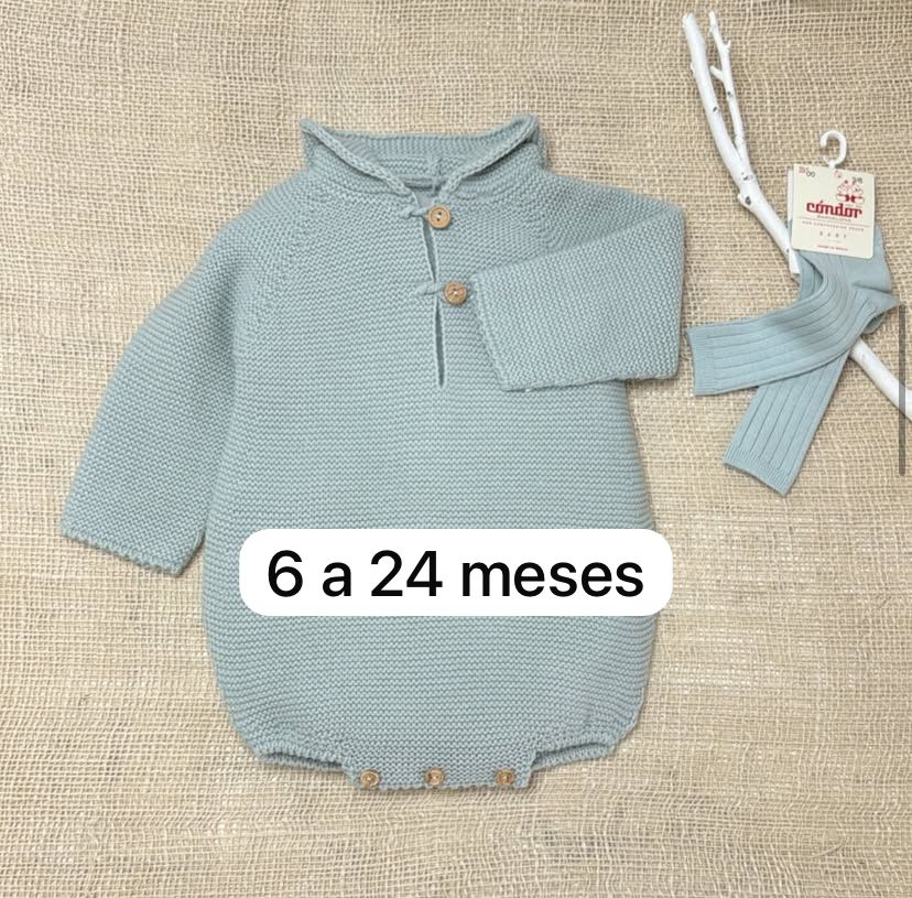 Calentito, suave y muy cómodo para los días fríos. Pelele de punto con capucha, acabado en punto bobo, botones de madera y apertura inferior para vestir y cambiar fácilmente.