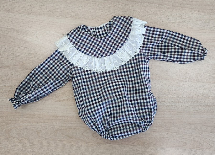 Este pelele en cuadros azul marino, blanco y burdeos destaca por su espectacular cuello volante de tul bordado en blanco, que aporta elegancia y dulzura a la prenda.