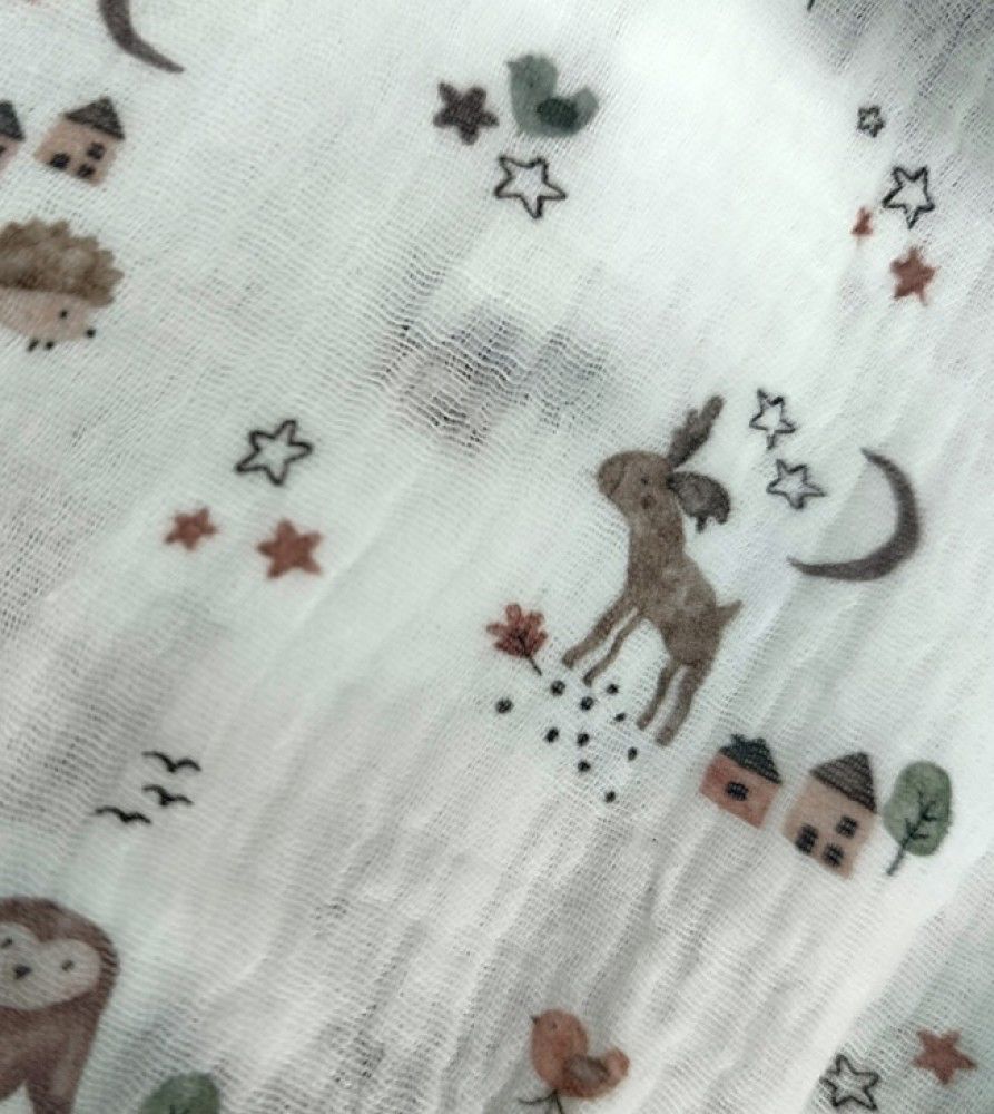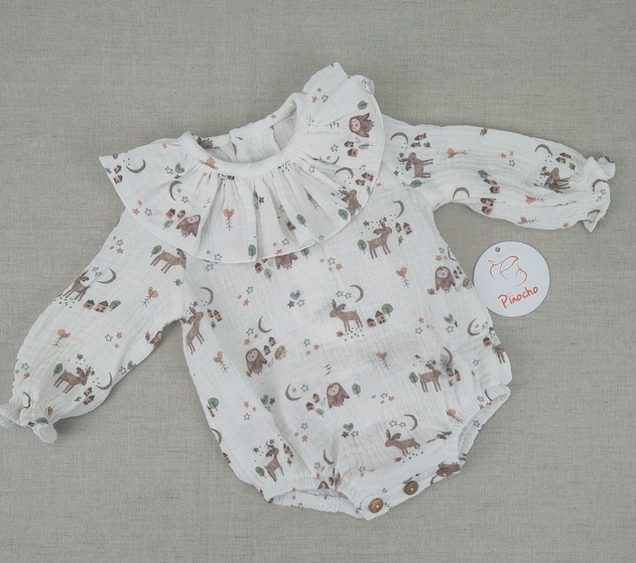 Un pelele delicado y cómodo para tu bebé, confeccionado en muselina suave y transpirable, con un tierno estampado de animalitos del bosque.
