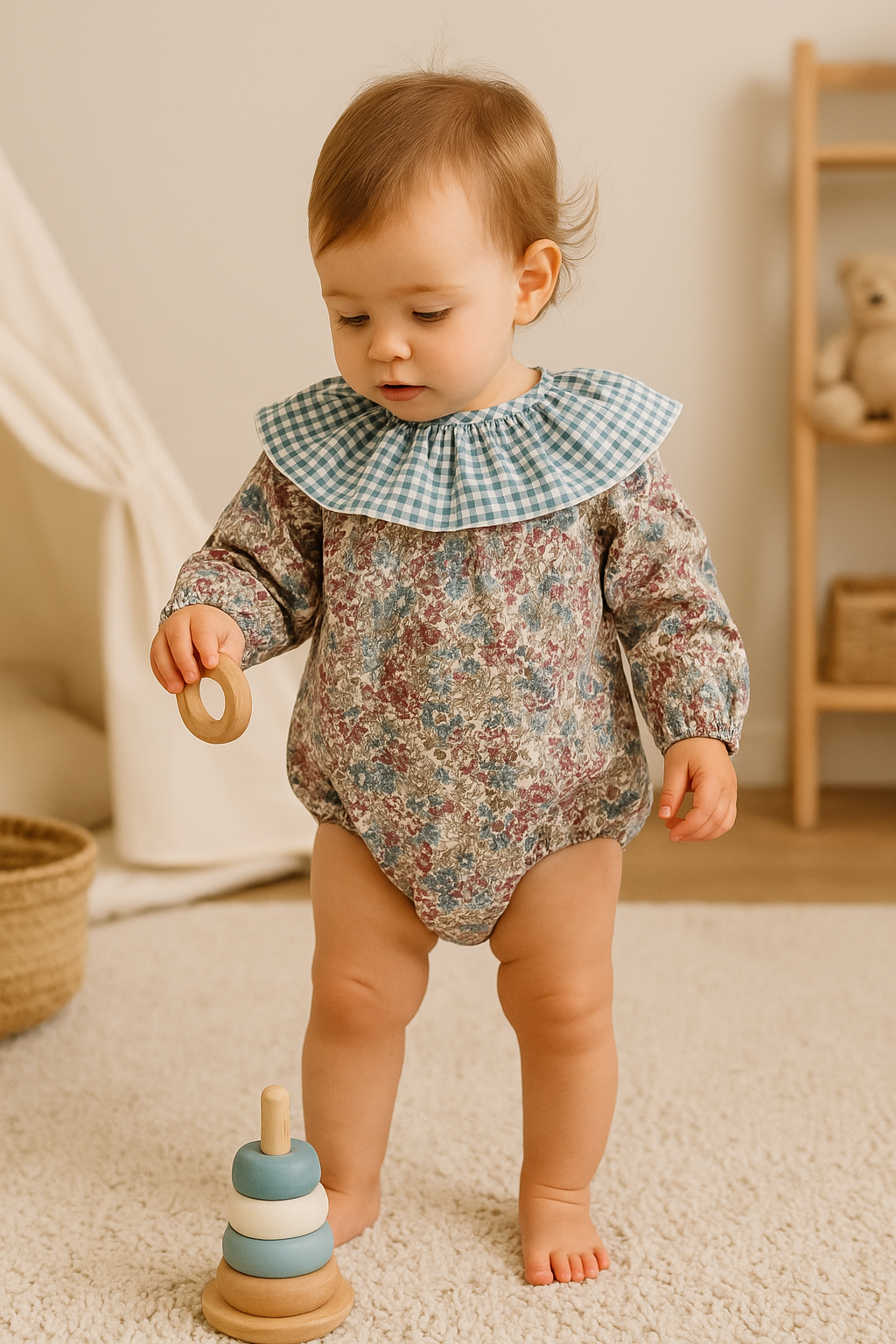 Este pelele combina un dulce estampado floral en tonos burdeos y azul con un elegante cuello de cuadros vichy azul verdoso.